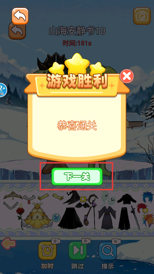 4、通关后点击【下一关】,继续挑战新的山海经角色换装,开启创意搭配之旅。