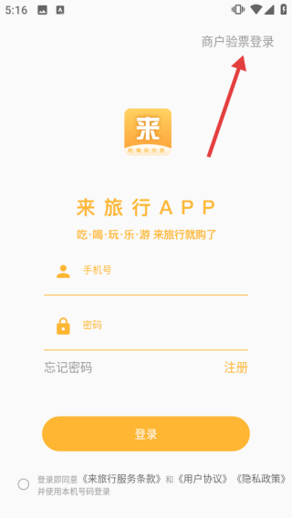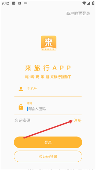 1、在来旅行APP登录页,点击右上角【商户验票登录】,切换商户登录模式。