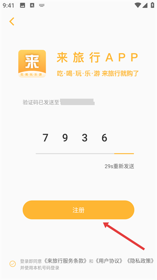 1、打开来旅行APP,在登录界面点击【注册】,开启旅行服务的使用之旅呢。