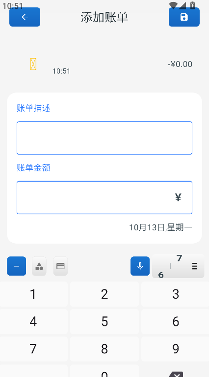 3、进入账单管理界面后,可根据支出或收入类型填写具体描述,添加金额与备注内容,完成账单录入操作。