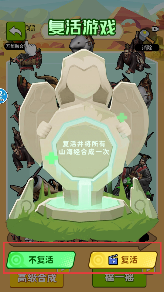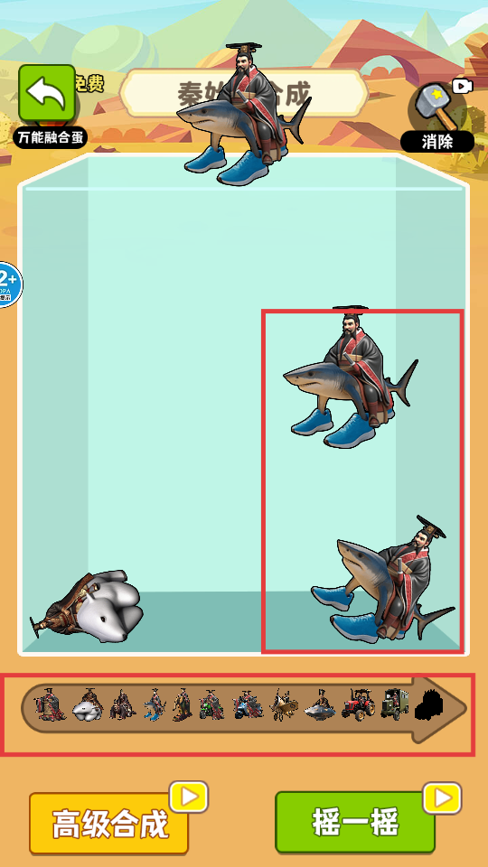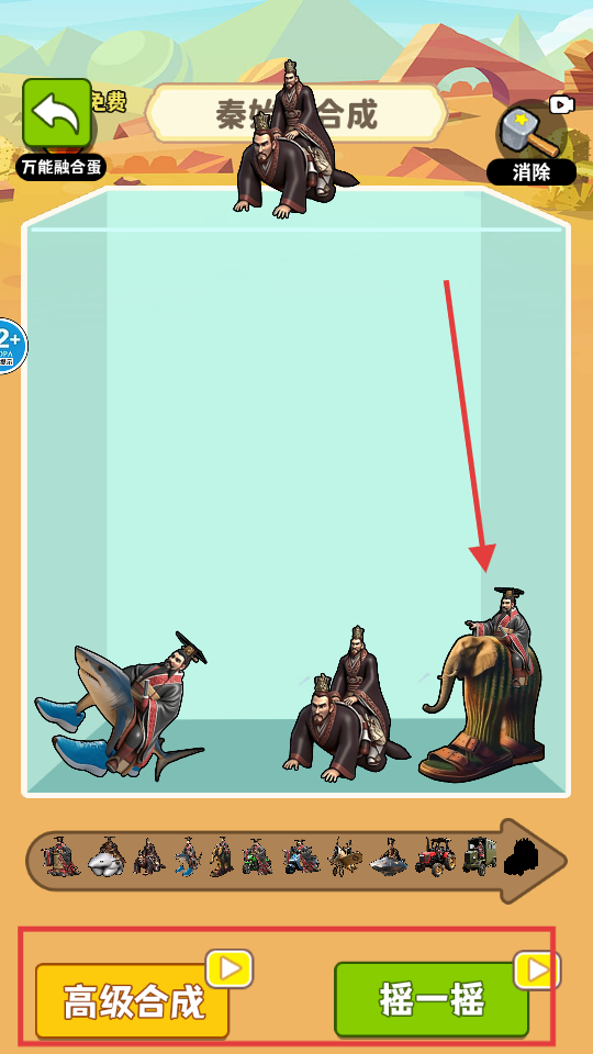 3、点击【摇一摇】或【高级合成】按钮,加速合成进程,尝试解锁更稀有【秦始皇】造型。