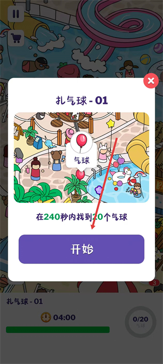 1、点击扎气球-01界面的开始按钮,进入240秒的找气球关卡。