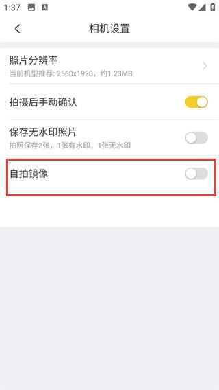 3、在相机设置页找到【自拍镜像】选项,此时该功能处于关闭状态。