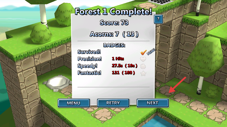 4、完成“Forest1”关卡后,界面会展示得分、橡果数量、徽章等成果,点击“NEXT”按钮可进入下一关。