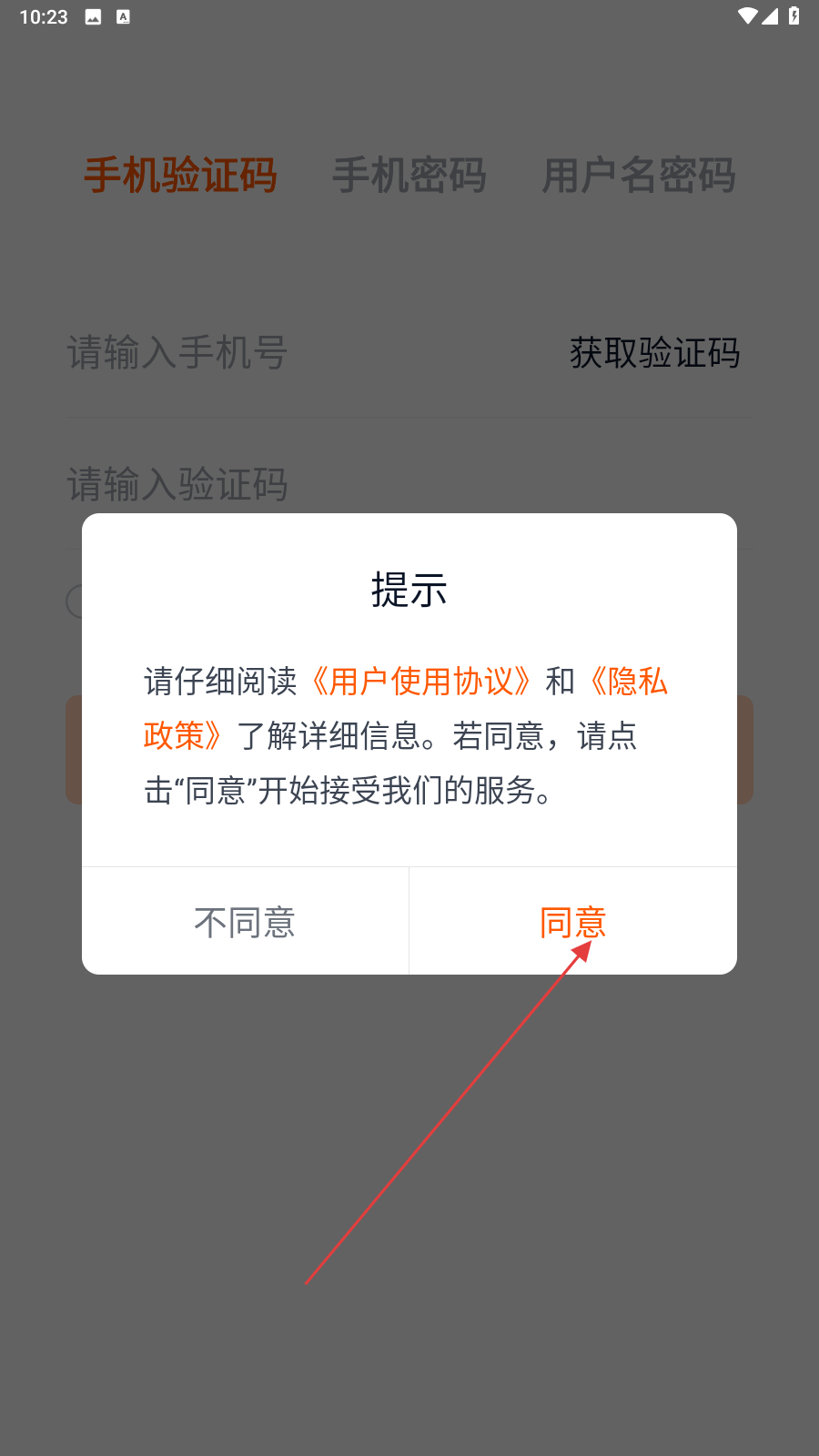1、在提示弹窗点击【同意】,接受《用户使用协议》和《隐私政策》。