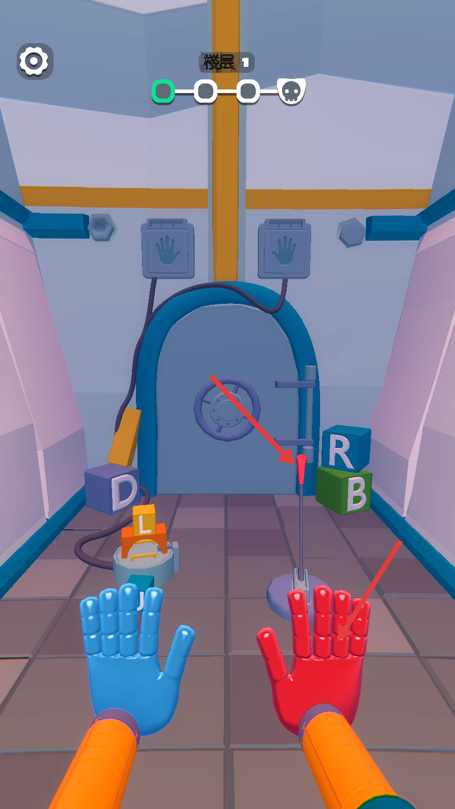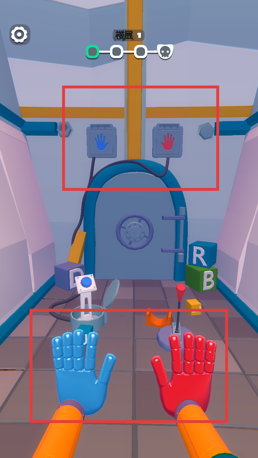 4、观察蓝色和红色手掌标识,让两只手掌与标识互动,尝试打开门。