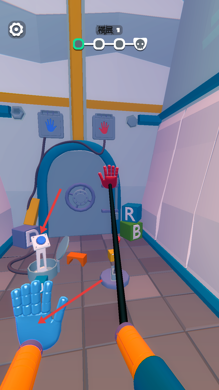 3、操控蓝色手掌,按下蓝色按钮等操作,推进解谜。