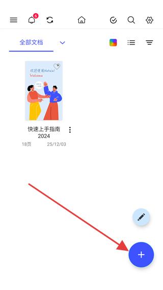 1、打开Notein一笔记首页,点击右下角蓝色【+】按钮,展开操作选项。