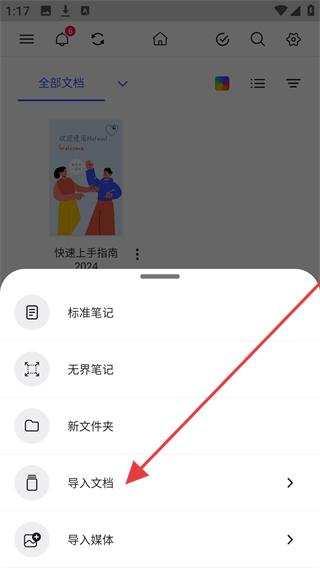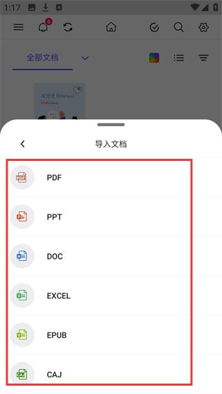 2、在选项中选择【导入文档】,进入文件类型选择页面。