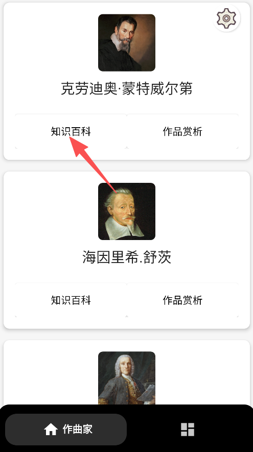 2、选择目标作曲家,点击知识百科查看简介内容。