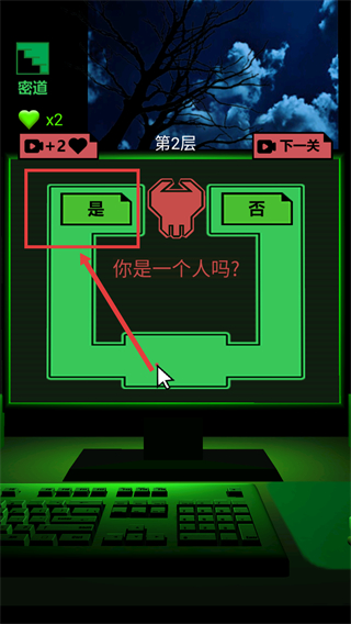 3、遇到【你是一个人吗?】的问题时,将鼠标移到【是】按钮并点击,继续推进到下一层。