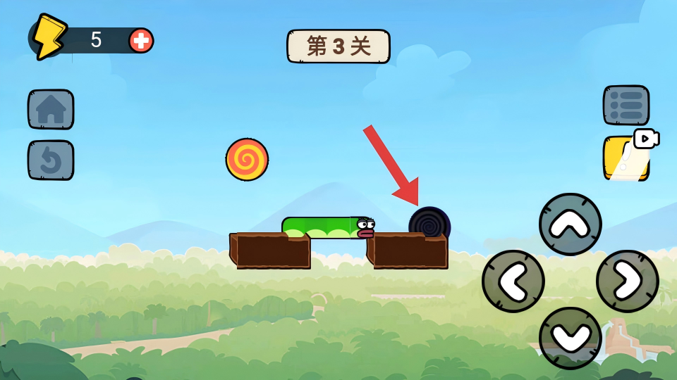 2、进入【第3关】后,通过操控红框内的【方向按钮】,控制小蛇移动吃到【苹果】。