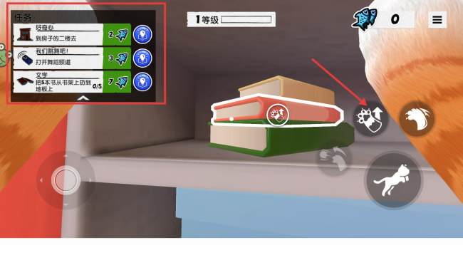 4、查看左侧任务栏,根据任务提示,如“把5本书从书架上扔到地板上”,点击对应交互按钮完成任务。
