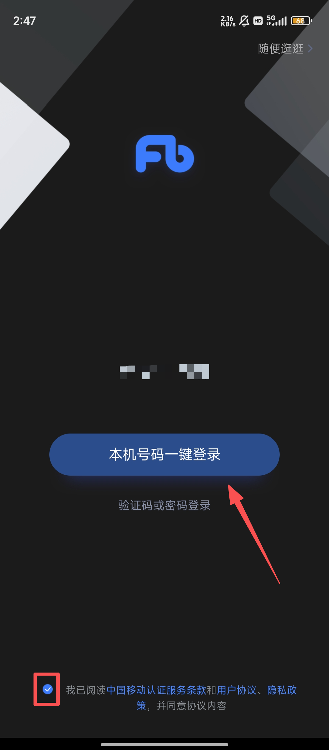 1、勾选下方条款,点击【本机号码一键登录】进入软件。