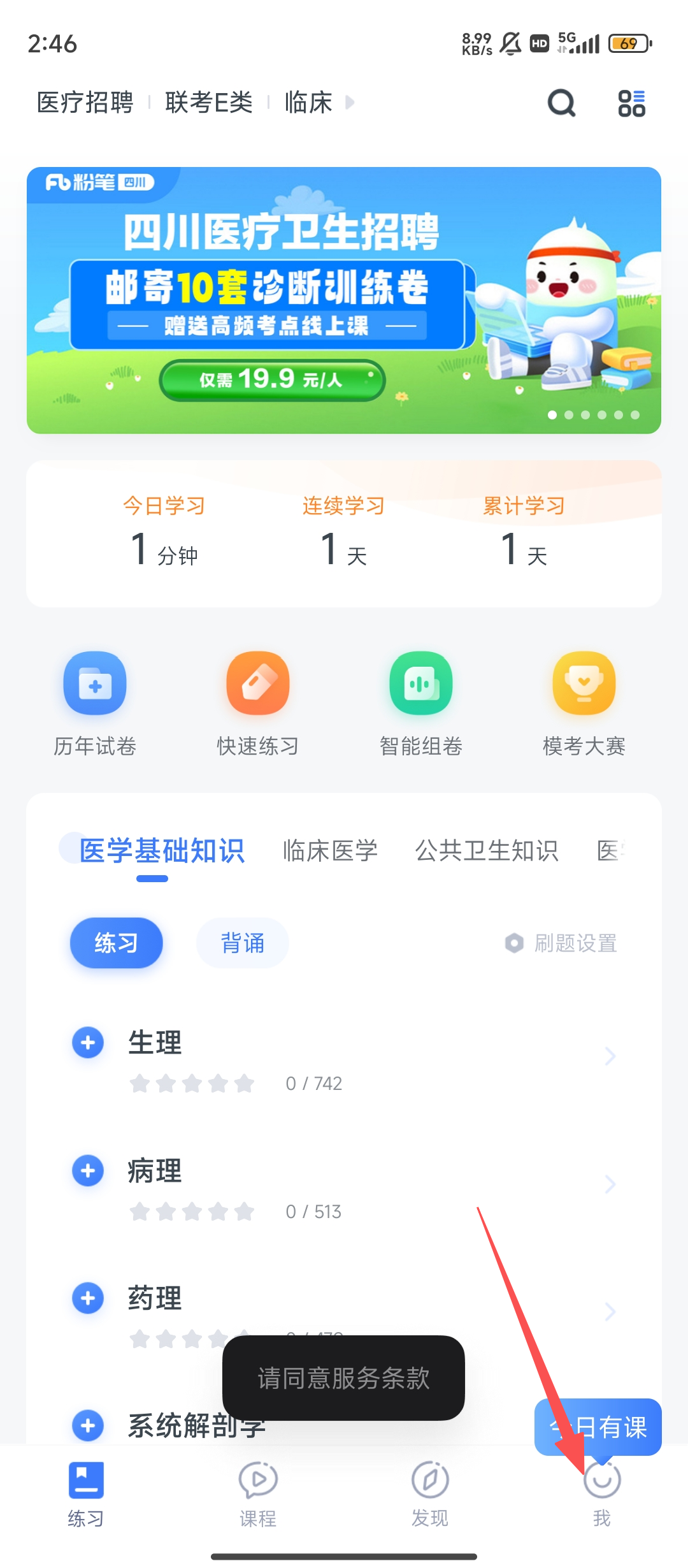 2、进入【粉笔医疗】后,在首页点击右下角的【我】,进入个人相关页面。