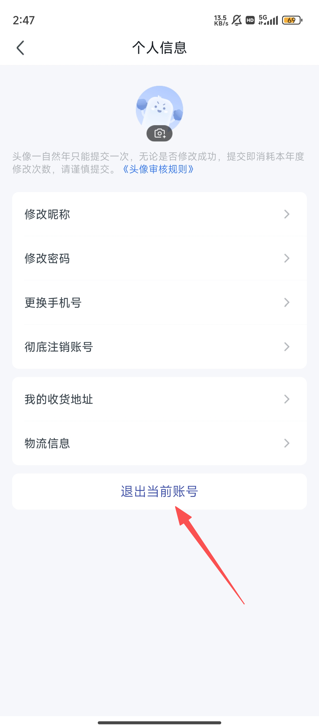4、在个人信息页面,找到并点击【退出当前账号】,即可完成退出登录操作。