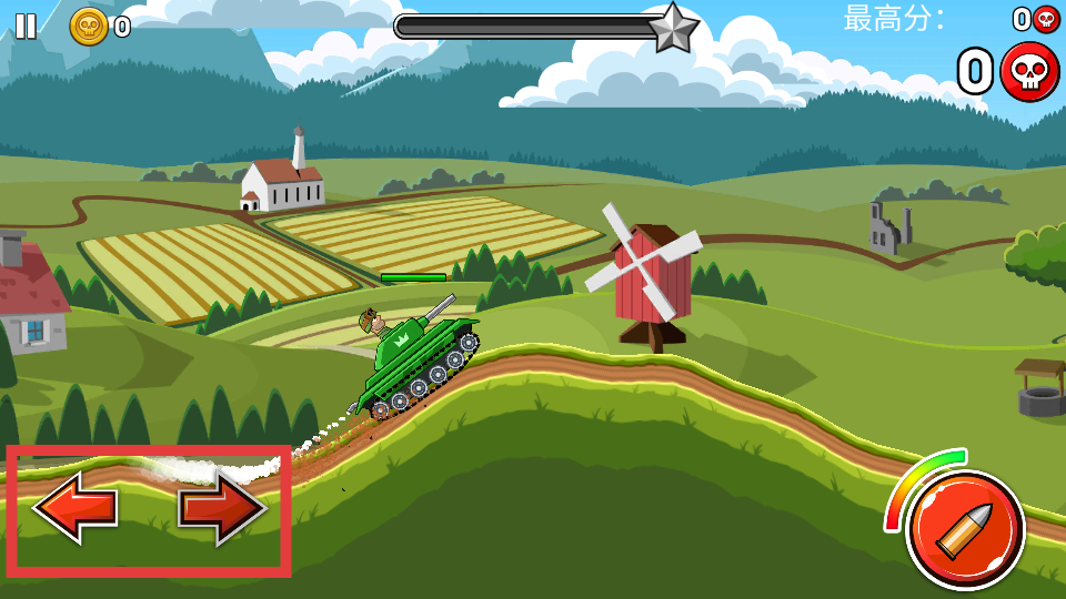 1、通过点击【红框】内左右方向箭头按钮,操控【绿色坦克】在起伏地形上移动。