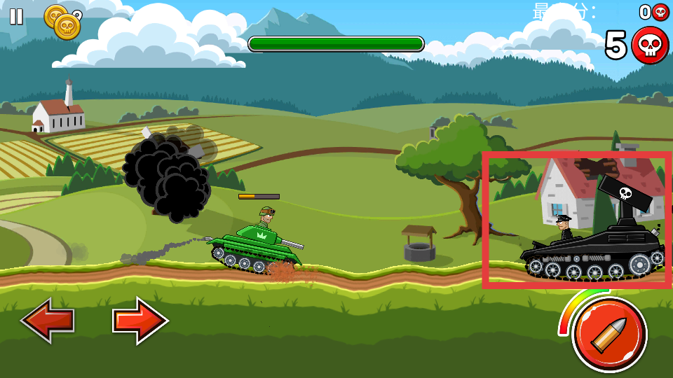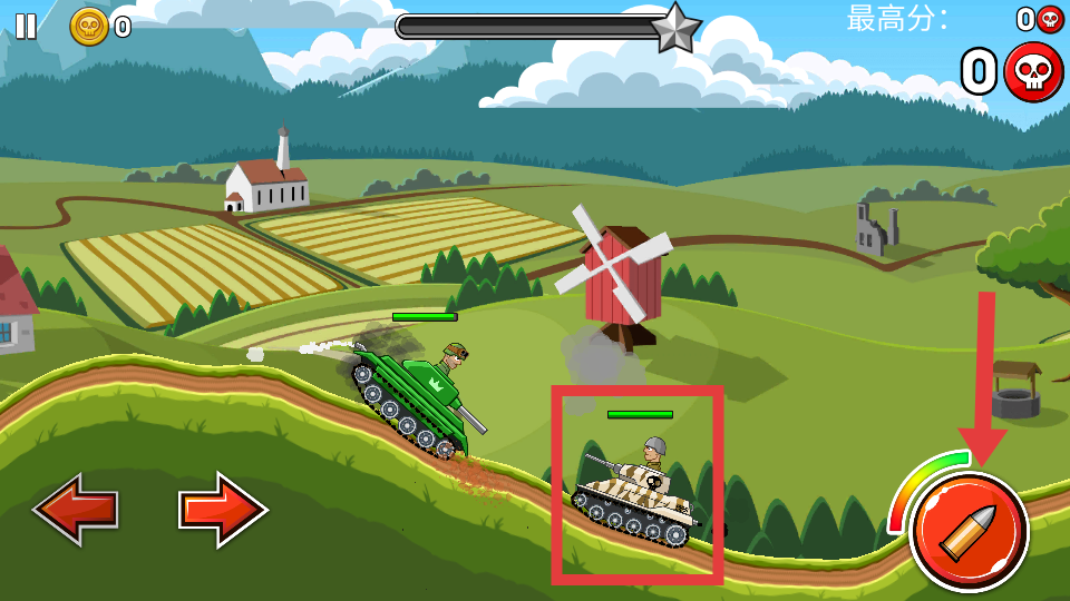 2、当遇到红框内敌方坦克时,点击右下角【炮弹】按钮,发射炮弹攻击敌方坦克。