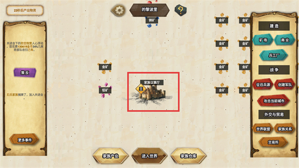 1、点击【家族议事厅】,需重点守护,同时可关注左侧事件获取额外部队或资源加成机会。