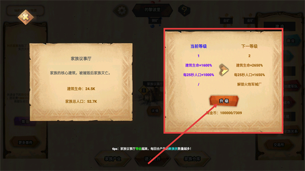2、查看【家族议事厅】等级详情,点击【升级】,提升建筑生命与人口增长效率。
