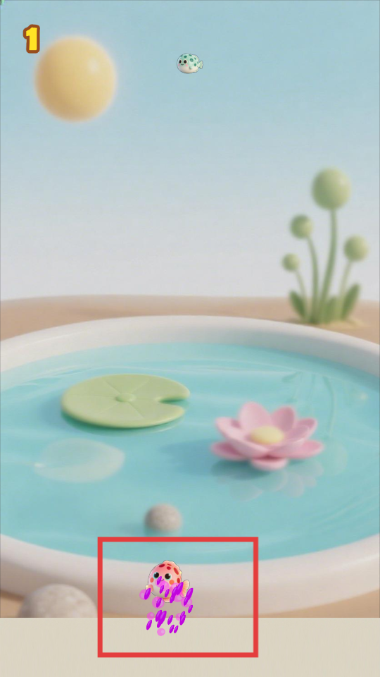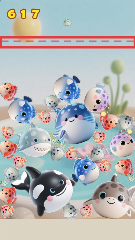 4、当完成合成的小鱼,到达方框内【红色虚线】后,将会导致游戏失败而结束游戏。