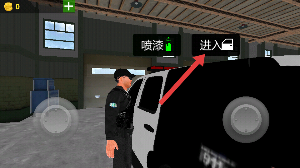 2、来到车库场景,点击【进入】按钮,操控角色进入警车,准备开始追捕行动。