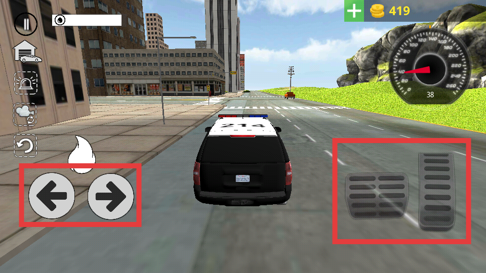 3、进入驾驶界面后,利用屏幕下方【红框】内的方向键和踏板按钮,控制警车的行驶方向与速度。