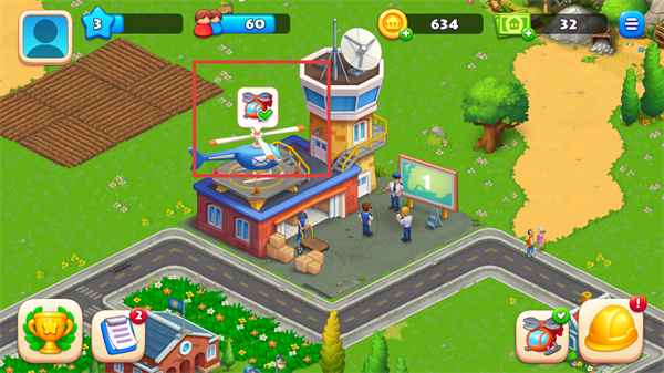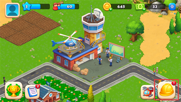 3、完成直升机订单后返回主界面,红框标注右下角黄色安全帽图标,停机坪直升机状态同步变化。