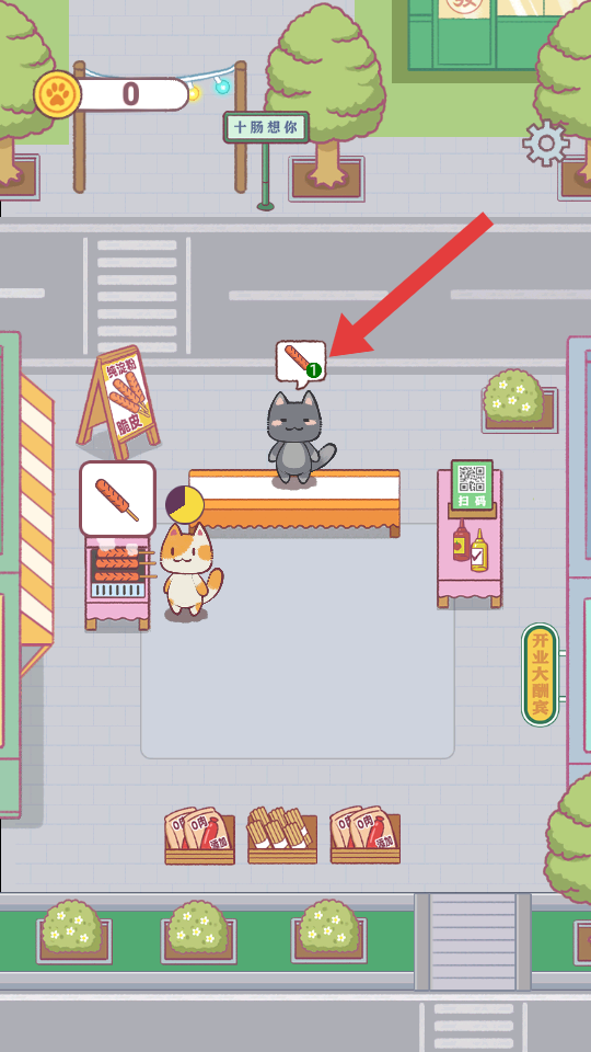 1、进入游戏,看到猫咪顾客头上显示【烤肠-1】的订单提示,这是需要制作的食品。