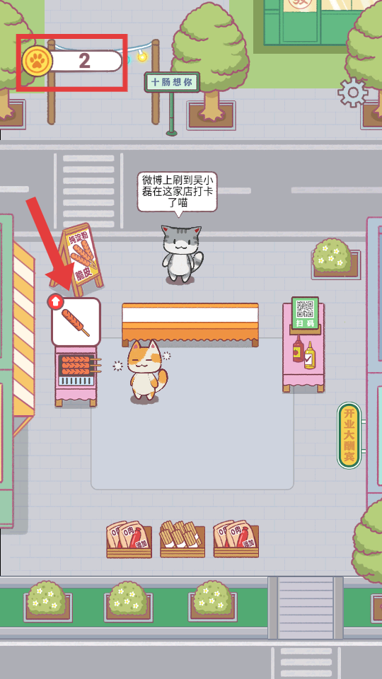 2、完成订单后,屏幕左上角红框处会显示获取的金币数量,点击带有向上箭头的烤肠图标进入升级。