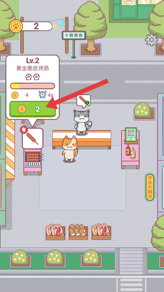 3、点击绿色的【2】金币区域,可升级菜品为【黄金脆皮烤肠】。