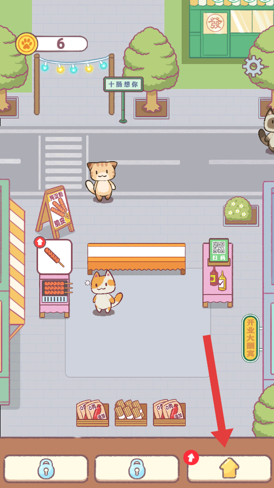 4、积累足够资源后,点击下方带向上箭头的图标,解锁新的菜品、设施等,拓展餐厅经营。