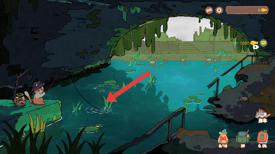 1、进入游戏后,点击箭头位置释放鱼饵,等待鱼儿上钩开始钓鱼。