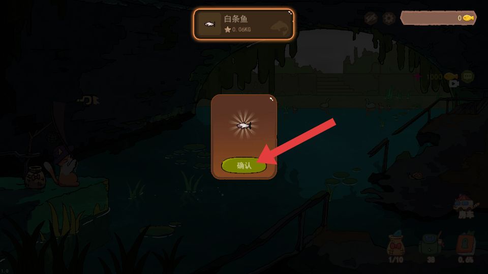 2、钓到【白条鱼-0.06KG】后,点击【确认】按钮,把鱼收入囊中。