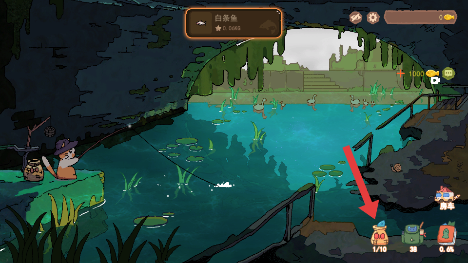 3、查看屏幕下方箭头指向处的鱼篓图标,知晓当前钓到鱼的数量【1/10】。