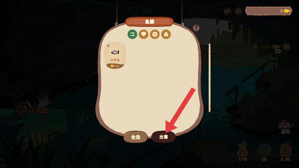 4、打开鱼篓界面,点击【出售】按钮,将钓到的鱼卖出换取货币。