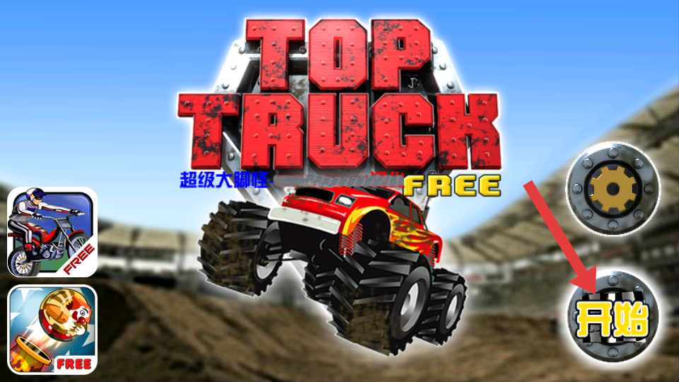 1、在游戏主界面,点击箭头所指的【开始】按钮,进入【超级大脚怪】游戏关卡。