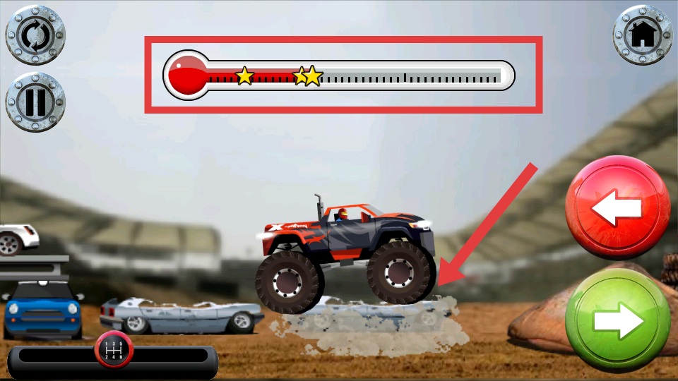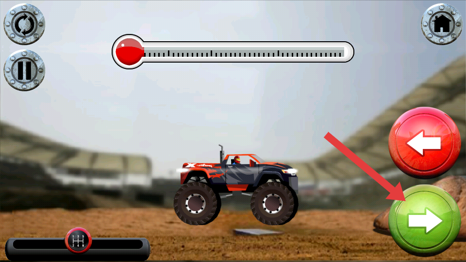 2、进入游戏后,通过点击右下角绿色的前进按钮,操控大脚怪车辆前进。