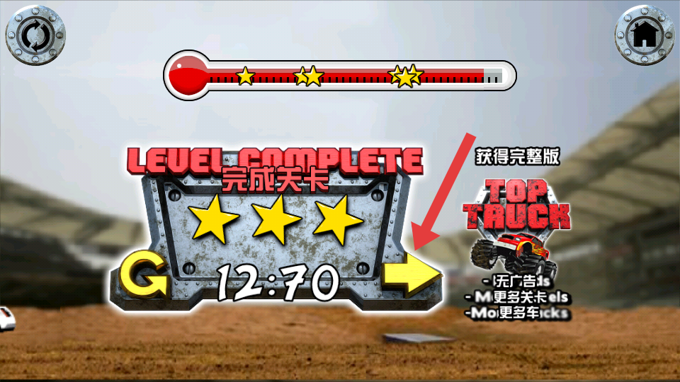 4、成功完成关卡,看到【LEVEL-COMPLETE】和星级评价后,点击箭头所指位置,进入下一关。