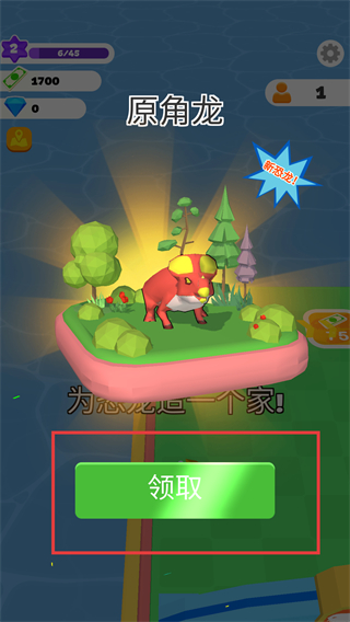 4、获得新恐龙【原角龙】后,点击绿色【领取】按钮。