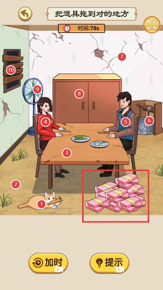 2、进入关卡后,根据提示,将方框内的【钱】拖动至标号上进行优化。
