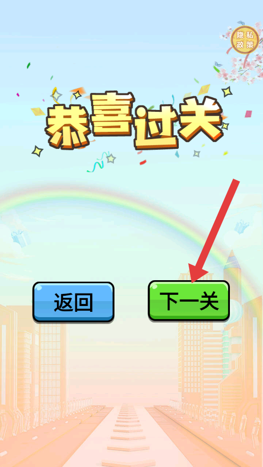 4、成功通关后,点击【下一关】按钮,继续挑战后续关卡。