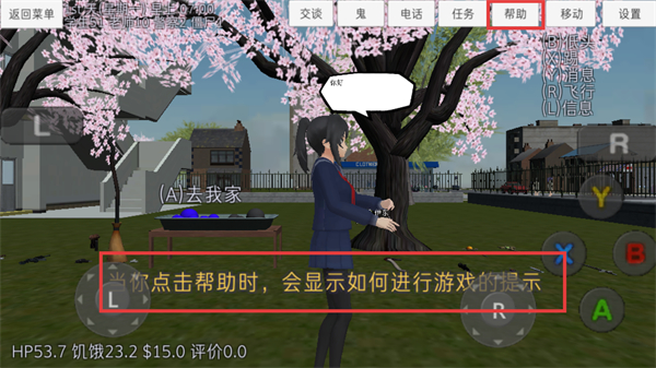 2、进入游戏樱花树场景后,红框标注顶部【帮助】按钮,下方提示“当你点击帮助时,会显示如何进行游戏的提示”。