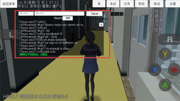 4、进入校园走廊场景,红框标注聊天界面,含输入名字/文本框、Send发送按钮。