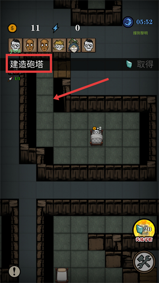 1、根据【建造砲塔】的提示,点击红色箭头指向的区域,准备建造砲塔。