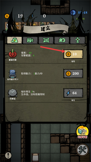 2、在建立界面,点击红色箭头指向的金币【10】,花费金币建立【番茄炸彈】砲塔。