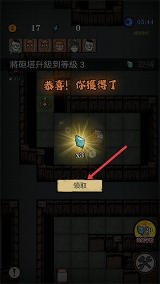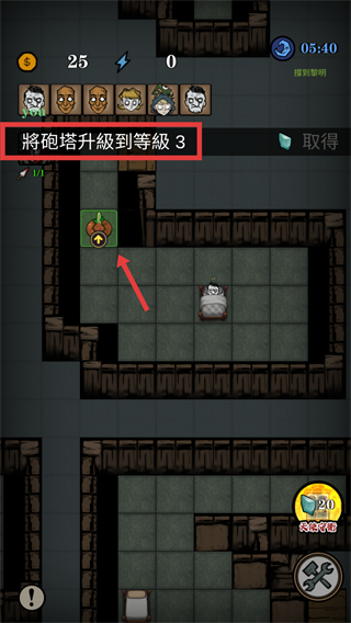 4、按照【將砲塔升級到等級3】的提示,点击红色箭头指向的砲塔处,进行砲塔升级操作。