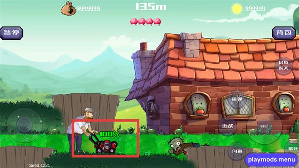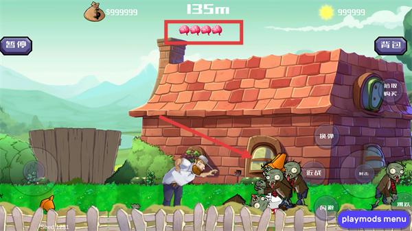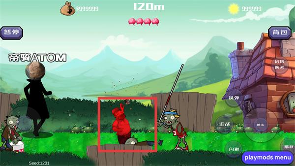 1、在【120m】进度的战斗中,操控戴夫与已购买的【帝骑ATOM】协同作战,查看自己为红色时是被僵尸进行攻击。