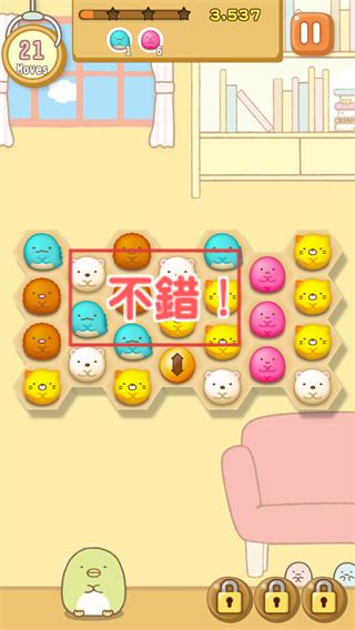 2、消除相同形象方块后触发【不錯!】提示,此时【MOVES】剩余21步,继续组合方块提升得分。