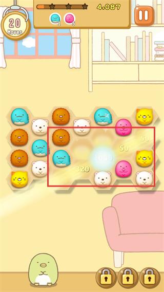 3、消除方块后出现【+20】等得分提示,【MOVES】剩余20步,优先消除密集相同形象区域。